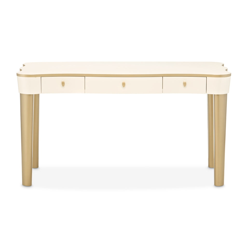Striking the perfect balance between style and function, the La Terrazza Vanity Desk brings sculptural elegance to any room. Its flowing wavy silhouette is wrapped in a creamy pearl finish, complemented by bold tapered legs in a lustrous gold tone. Whether used as a statement vanity or a refined writing desk, this piece offers graceful versatility. Three drawers keep beauty or office essentials neatly tucked away, while a finished back allows for floating placement in open floorplans. Understated yet impactful, it brings a touch of luxury to bedrooms, dressing rooms, or home offices alike.